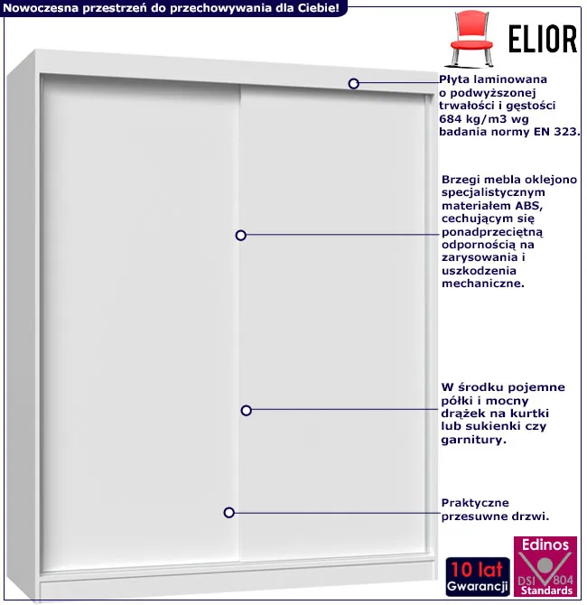 Szafę Stoflis 6X marki Edinos Premium wykonano z wykorzystaniem naturalnej płyty meblowej, zbudowanej z włókien drzewnych i związków organicznych w warunkach wysokiego ciśnienia i temperatury. Włókna ułożone są różnokierunkowo, o strukturze sinusoidalnej, co zapewnia nadanie jej cech jakościowych oraz wytrzymałościowych. Dodatkowo płyta została uszlachetniona cienkimi filmami melaminowymi w celu zwiększenia jej trwałości. Brzegi mebla oklejono specjalistycznym materiałem ABS, cechującym się ponadprzeciętną odpornością na zarysowania i uszkodzenia mechaniczne. Posiada właściwości termoizolacyjne, dodatkowo nie odkształca się samoistnie przy zmianie temperatury. Praktyczne przesuwne drzwi umieszczono na trwałej prowadnicy rolkowej, co zaoszczędza dodatkową przestrzeń, dlatego doskonale sprawdza się nawet w wąskich wnętrzach. Przekonaj się sama!