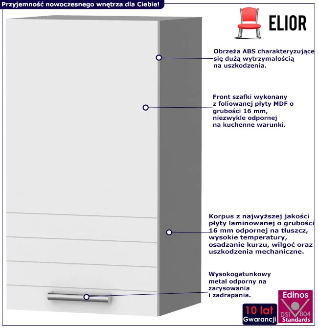Kolekcję mebli kuchennych Sergio marki Elior wykonano z dbałością o najdrobniejszy szczegół, aby każda z szafek cieszyła Cię niezmiennie latami. Funkcjonalność i najwyższej jakości materiały połączono z nowoczesnym designem. Fronty ozdobiono stylowym frezowaniem, które dodaje kolekcji nietuzinkowego uroku. Wykonano je z najwyższej jakości płyty MDF o grubości 16 mm, specjalnie foliowanej. Materiał ten idealnie sprawdzi się w trudnych warunkach kuchennych i nie straszne mu uderzenia czy tłuste opary i wysoka temperatura. Białe matowe fronty idealnie kontrastują z szarym korpusem. Wykonano go z niezwykle trwałej płyty laminowanej 16 mm grubości marki Elior dedykowanej wnętrzom kuchennym. Szafki posiadają mocne uchwyty stworzone z wysokogatunkowego metalu, a do ich produkcji wykorzystano także niezwykle trwałe obrzeża ABS. W kolekcji Sergio znajdziesz szafkę z najwyższej jakości szkłem podwójnie hartowanym o eleganckim satynowym wykończeniu, która może stanowić idealne miejsce na zastawę stołową. Natomiast górne szafki otwierane do góry zawierają specjalne gazowe podnośniki. Postaw na jakość kolekcji Sergio, która sprawi Ci niezmierną przyjemność.
