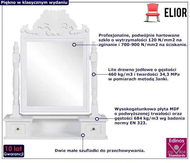 Przenieś elegancję minionych epok do swojego domu z toaletką Arrao marki Edinos Premium. Ta klasycznie stylizowana toaletka sprawdzi się stojąc zarówno na biurku, jak i na stole. Zaprojektowana z myślą o wszystkich, którzy cenią sobie detal i szykowny design. Toaletka posiada lustro i dwie małe szufladki oraz dekoracyjne zdobienia, które nadają jej niepowtarzalnego charakteru. Idealnie uzupełni wystrój Twojej sypialni.