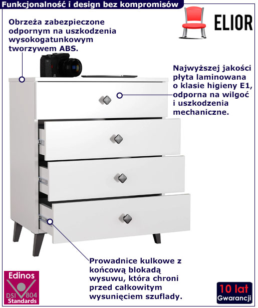 • Produkt posiada certyfikat jakości "Edinos Standards DSI 804", który potwierdza najwyższą jakość wykonania mebla oraz pełny stopień zgodności poszczególnych jednostek wytworzonego wyrobu z przyjętym wzorcem.