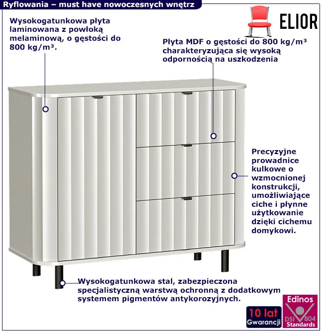 • Produkt posiada certyfikat jakości "Edinos Standards DSI 804", który potwierdza najwyższą jakość wykonania mebla oraz pełny stopień zgodności poszczególnych jednostek wytworzonego wyrobu z przyjętym wzorcem.