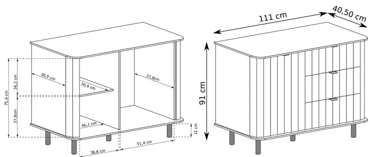 • szerokość: 111 cm, głębokość: 40,5 cm, wysokość: 91 cm