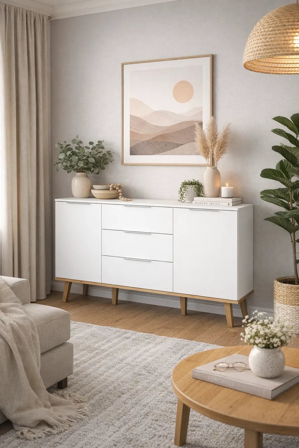 Komoda Olenako 3X to jeden z wyjątkowych elementów tej kolekcji, charakteryzujący się połączeniem funkcjonalności oraz niepowtarzalnego stylu skandynawskiego. Dzięki czterem pojemnym półkom ukrytym za eleganckimi frontami oraz trzem praktycznym szufladom, komoda oferuje nie tylko mnóstwo miejsca do przechowywania, ale także estetyczne podkreślenie nowoczesnego charakteru Twojego wnętrza.