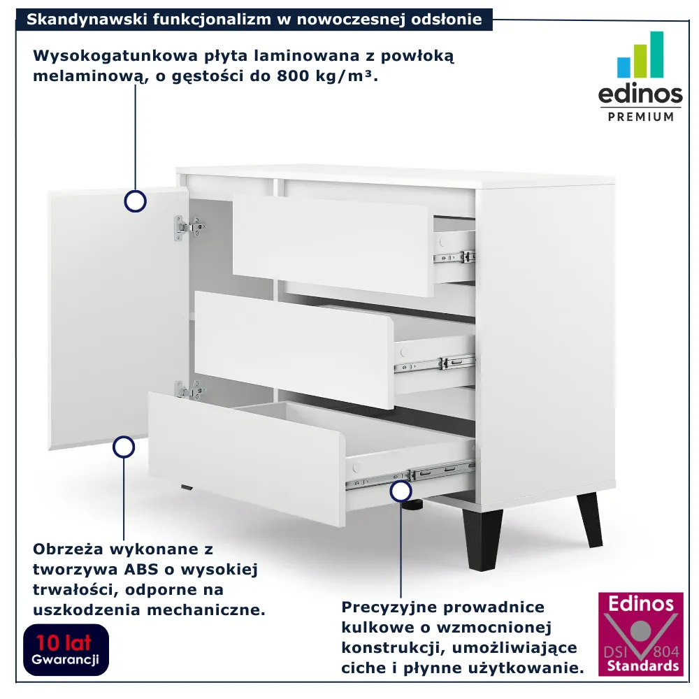 Jeśli poszukujesz stylowego i funkcjonalnego mebla, który idealnie wpasuje się w każdą przestrzeń, komoda Bilgo 3X marki Edinos Premium jest stworzona właśnie dla Ciebie. Jej nowoczesny design i klasyczna kolorystyka sprawią, że stanie się nieodzownym elementem Twojego wnętrza, przyciągając wzrok i ciesząc swoją praktycznością. Bilgo 3X doskonale sprawdzi się w nowoczesnym salonie, romantycznej, prowansalskiej sypialni lub w skandynawskim pokoju dziecięcym. Bilgo 3X – aranżacyjna perełka w stylu scandi!