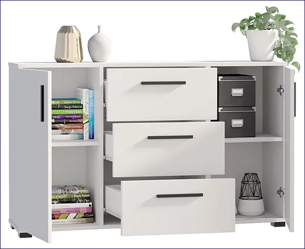 - Stylowe ergonomiczne uchwyty oraz solidne stopki stabilizujące mebel.