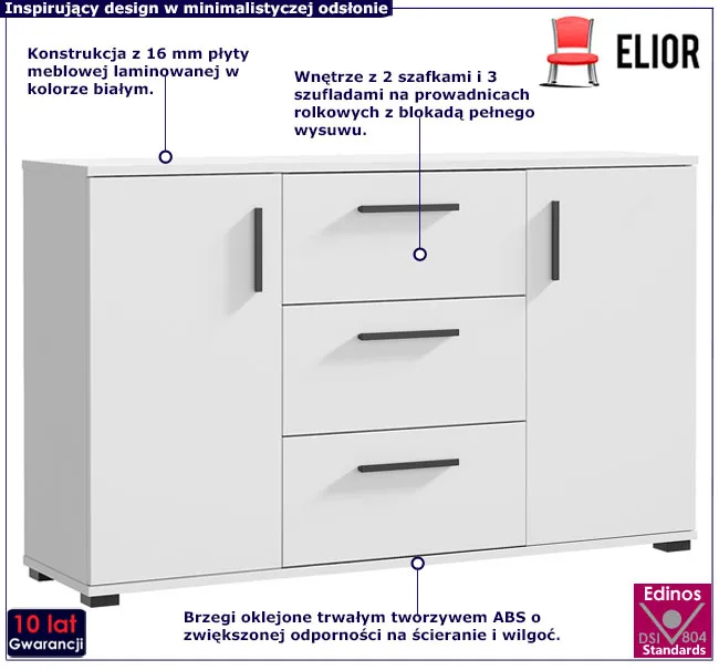 - Modny kolor: Biały. W ofercie posiadamy także inne komody białe nowoczesne w sklepie Edinos.pl. Kliknij i stwórz swój wyjątkowy zestaw mebli.