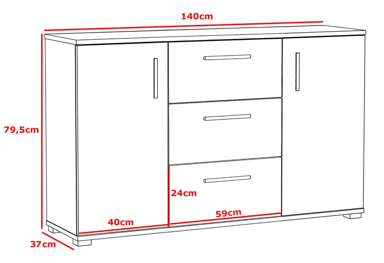 - Wymiary: wysokość: 79,5 cm, szerokość: 140 cm, głębokość: 37 cm.