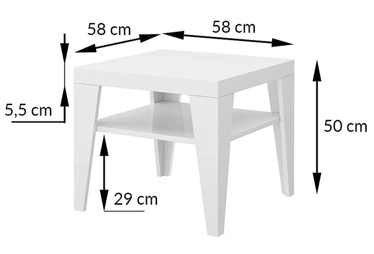 - Wymiary: szerokość mebla: 58 cm, wysokość mebla: 50 cm, głębokość mebla: 58 cm.