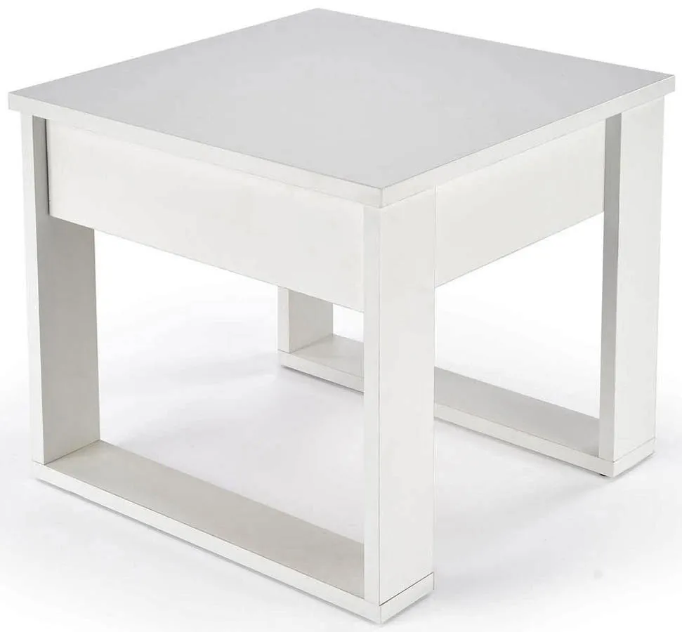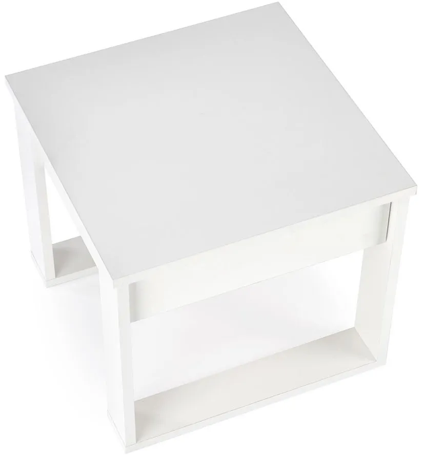 Laminowana płyta meblowa – blat ławy jest gładki, trwały i odporny na zarysowania, a biała kolorystyka dodaje wnętrzu lekkości.