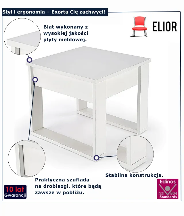 - Produkt posiada certyfikat jakości "Edinos Standards DSI 804", który potwierdza najwyższą jakość wykonania mebla oraz pełny stopień zgodności poszczególnych jednostek wytworzonego wyrobu z przyjętym wzorcem.