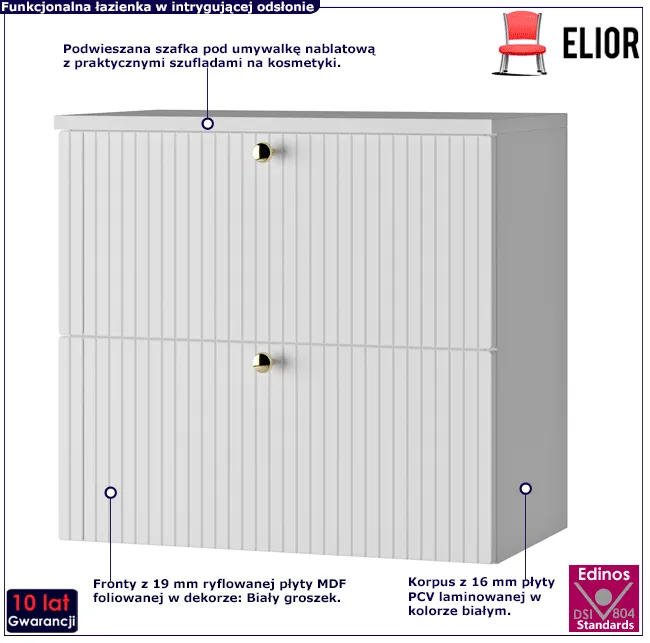 Nepal 5X marki Elior to funkcjonalna szafka umywalkowa zaprojektowana z myślą o wymagających użytkownikach, dla których w równym stopniu liczy się praktyczny wymiar mebla, jego unikalny design i wysoka jakość. Korpus szafki Nepal 5X powstał z wysokogatunkowej 16 mm laminowanej płyty o klasie higieny E1. Płyta wyróżnia się ponadprzeciętną trwałością i odpornością na wilgoć i parę.  Fronty zostały wykonane z 19 mm płyty MDF dedykowanej do wnętrz o zwiększonej wilgotności. Dla zwiększenia trwałości płyta została zabezpieczona najwyższej jakości dekoracyjną folią. Detale w postaci ekspresyjnych ryflowań i stylizowanych uchwytów nadają całości ciekawego efektu dekoracyjnego. Drzwi frontowe wyposażone w system cichego domyku Blumer 4X Plus otwierają się bezawaryjnie ułatwiając dostęp do ukrytych wewnątrz 2 pojemnych szuflad na łazienkowe utensylia. Tak wykonana szafka Nepal 5X marki Elior doskonale wyposaży Twoją łazienkę i zapewni komfort każdego dnia!