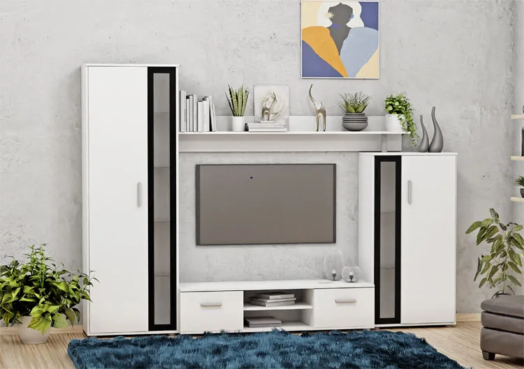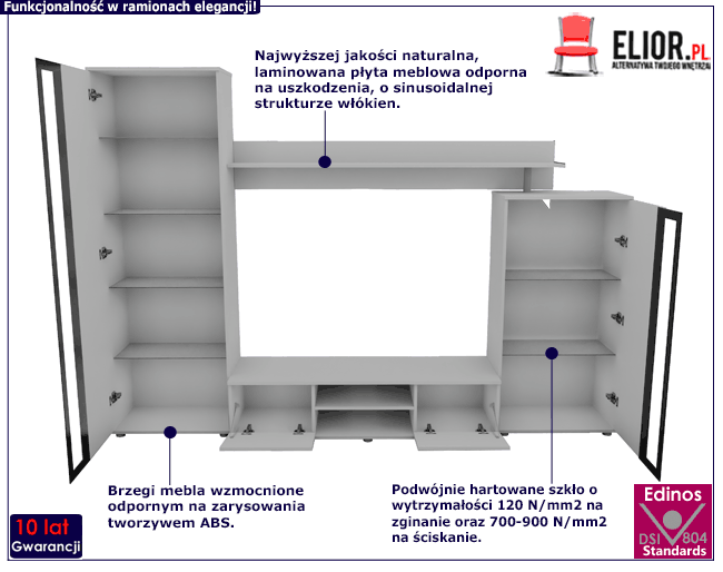 Co sprawia, że nasze meble zachwycają coraz to większą liczbę odbiorców? Z pewnością oryginalny, elegancki design oraz najwyższa jakość wykonania. Jak to robimy? Dbamy o wysokojakościowe materiały, które wykorzystujemy do ich produkcji i przykładamy olbrzymią uwagę do każdego detalu. W przypadku meblościanki Mudora, jej głównym surowcem jest naturalna, laminowana płyta meblowa, zbudowana z włókien drzewnych i związków organicznych w warunkach wysokiego ciśnienia i temperatury. Włókna ułożone są różnokierunkowo o strukturze sinusoidalnej, co zapewnia nadanie jej cech jakościowych oraz wytrzymałościowych. Dodatkowo płyta została uszlachetniona cienkimi filmami melaminowymi w celu zwiększenia jej trwałości. Brzegi mebla oklejono specjalistycznym materiałem ABS, cechującym się ponadprzeciętną odpornością na zarysowania. Szklane półki także wyróżniają się ogromną trwałością, gdyż tworzy je podwójnie hartowane szkło. Powoduje ono, że uzyskany materiał charakteryzuje się 5-7 krotnie wyższą wytrzymałością mechaniczną od zwykłego szkła. Szkło hartowane ma wytrzymałość do 120 N/mm2 na zginanie oraz około 700-900 N/mm2 na ściskanie. Dzięki wykorzystaniu najnowszych technologii produkcyjnych podczas procesu podwójnego hartowania, uzyskany materiał cechuje najwyższy poziom odporności i bezpieczeństwa użytkowania. Takim sposobem meblościanka Mudora jest gotowa aby wkroczyć do salonu, zdobić go swoją obecnością i służyć niezwykłą funkcjonalnością. Już wkrótce może zagościć właśnie w Twoim wnętrzu!