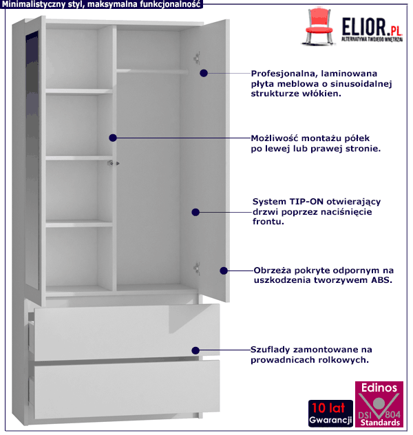 Nie szukaj niskojakościowych mebli, które poza wyglądem nie są w stanie zapewnić Ci niczego więcej. Postaw na sprawdzony produkt marki Edinos Premium - szafa Bafix! Funkcjonalność, trwałość i subtelny design w jednym meblu! Nie czekaj więc dłużej i zamów ją w promocyjnej cenie 1068 zł zamiast ceny regularnej 1068 zł już dziś!