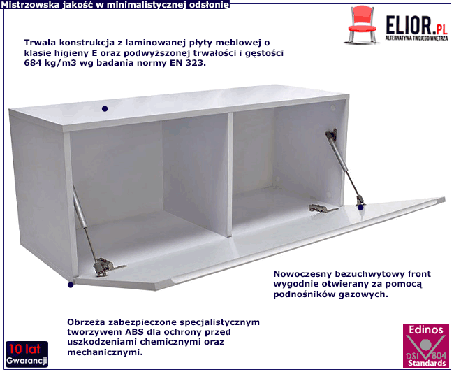 - Podnośniki gazowe spowalniające otwieranie szafki dla komfortu i bezpieczeństwa.
