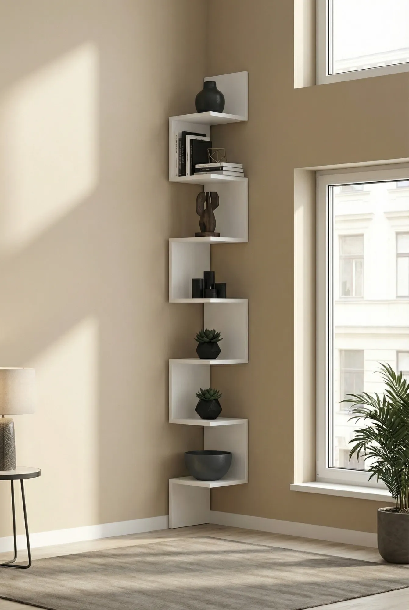 Aranżacja wnętrza z narożną białą półką Flora 5X