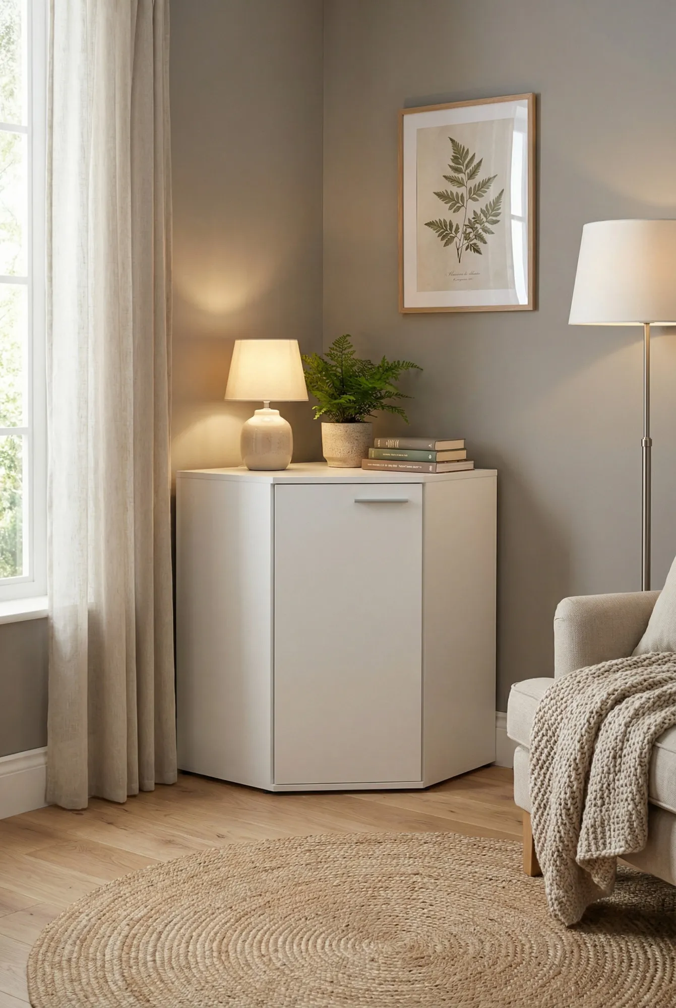 Biała szafka narożna z półkami Asendri 6X w nowoczesnym salonie
