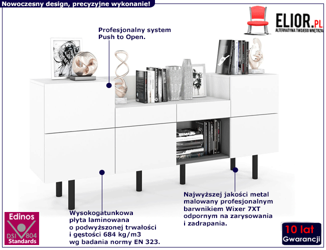 - Produkt posiada certyfikat jakości "Edinos Standards DSI 804", który potwierdza najwyższą jakość wykonania mebla oraz pełny stopień zgodności poszczególnych jednostek wytworzonego wyrobu z przyjętym wzorcem.