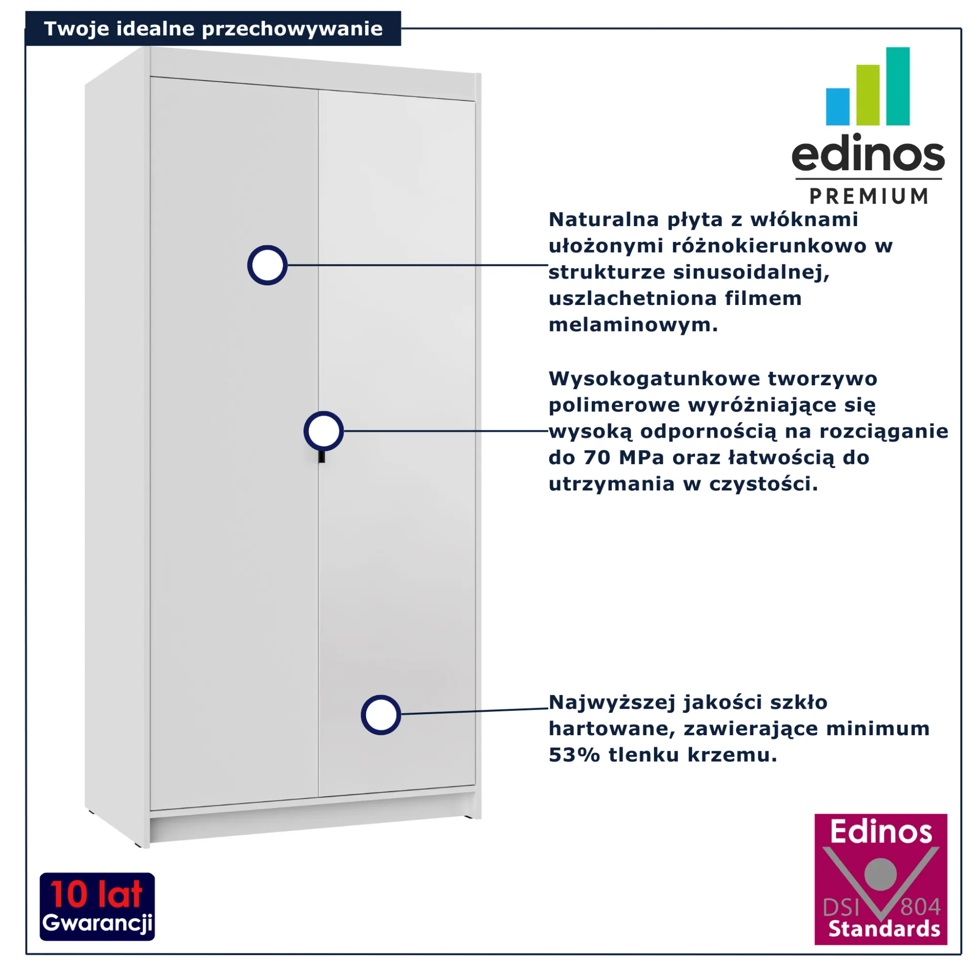 • Produkt posiada certyfikat jakości "Edinos Standards DSI 804", który potwierdza najwyższą jakość wykonania mebla oraz pełny stopień zgodności poszczególnych jednostek wytworzonego wyrobu z przyjętym wzorcem.
