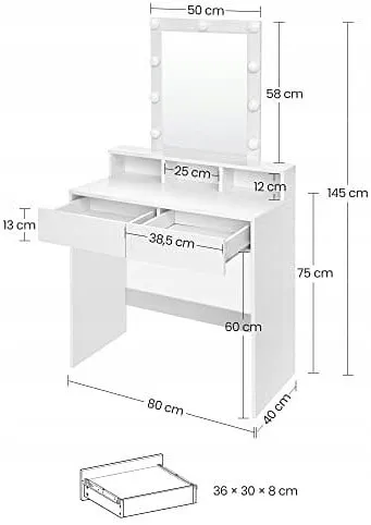 Uwielbiam tę toaletkę. Jest nie tylko piękna, ale też bardzo praktyczna. Podświetlane lustro sprawia, że robienie makijażu to czysta przyjemność, a dwie duże szuflady pomieszczą wszystkie moje kosmetyki. Design jest nowoczesny i świetnie komponuje się z resztą mojej sypialni. Gorąco polecam!