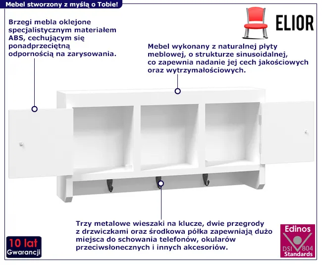 Witaj w naszym sklepie! Mam dla Ciebie idealną białą, wiszącą szafkę na klucze z zewnętrznymi haczykami i półkami ukrytymi za drzwiczkami! Ścienna szafka Krega 4X marki Elior to prawdziwy multitaskingowiec, który pozwoli na przechowywanie kluczy, a także innych drobiazgów, takich jak biżuteria, karty bankowe czy okulary przeciwsłoneczne. A jeżeli chcesz coś ukryć przed "wścibskimi" oczami gości możesz skorzystać z przegród z drzwiczkami. Wisząca półka Krega 4X jest idealna dla zapominalskich, którzy zawsze gubią klucze w najmniej oczekiwanych momentach. Dzięki trzem haczykom, możesz wieszać tam klucze całej rodziny a nawet sąsiadów, jeżeli tylko Ci na to pozwolą. Tak właśnie spełniamy marzenia wszystkich zapominalskich i wiecznych "poszukiwaczy" kluczy!