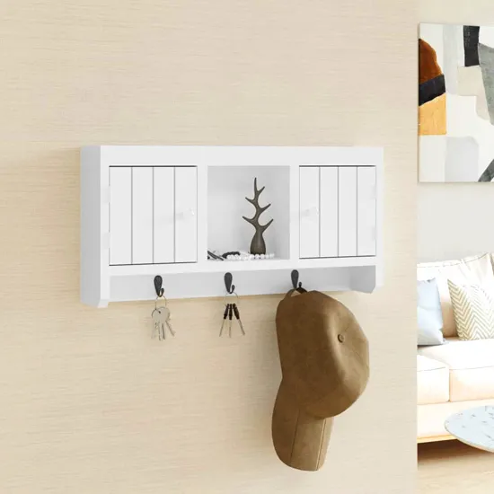 Biała półka ścienna z wieszakami na klucze - Krega 4X