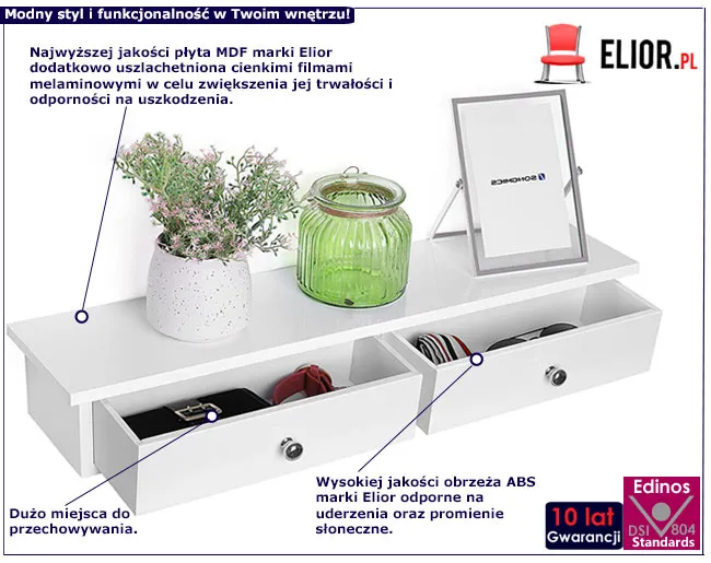 Białą półkę z dwoma szufladami Fiko wykonano z najwyższej jakości płyty MDF marki Elior charakteryzującej się wysoką odpornością na uszkodzenia mechaniczne. Wyjmowane szuflady i pokrycie powierzchni mebla cienkimi filmami melaminowymi sprawia, że niezwykle łatwo utrzymać go w czystości. Wybierz minimalistyczną półkę o funkcjonalności, która doda niezwykłego wdzięku Twojemu wnętrzu.