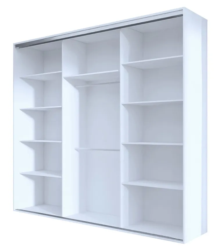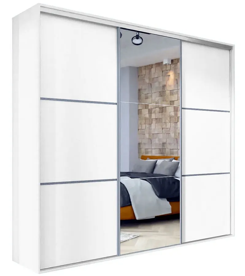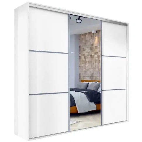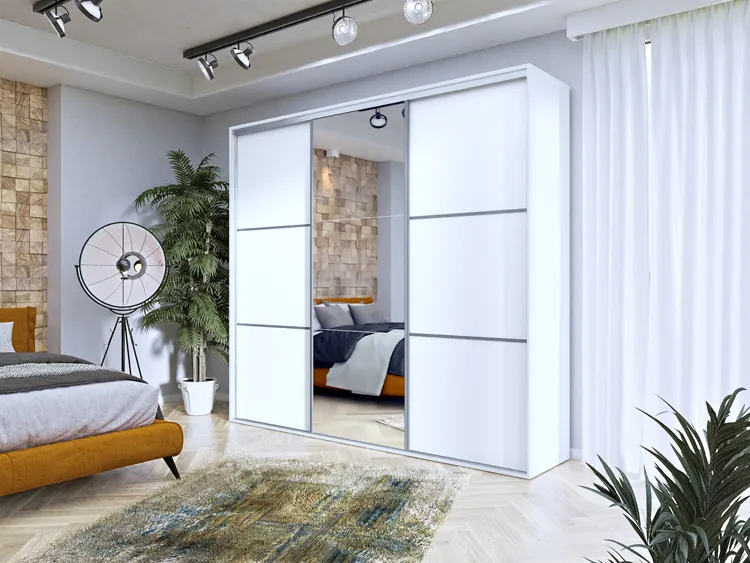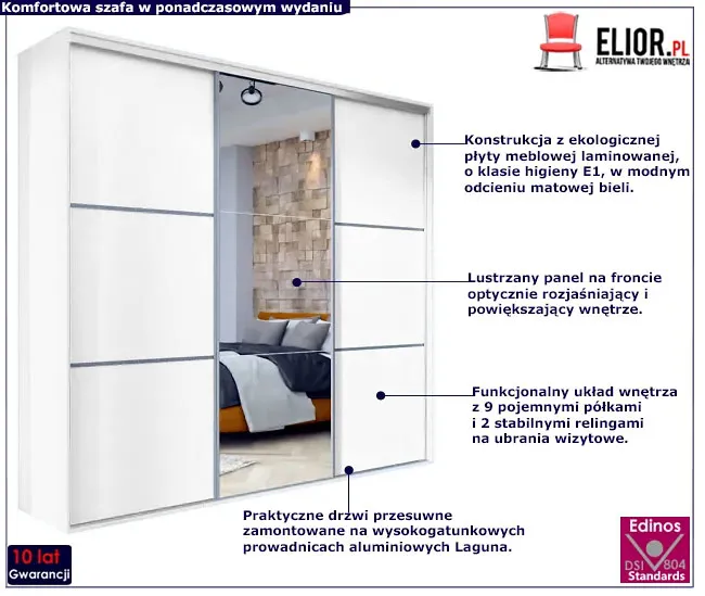Szafa przesuwna Estori 6X 275 cm to propozycja marki Edinos Premium skierowana do osób poszukujących profesjonalnie zaprojektowanych, fachowo wykonanych, funkcjonalnych mebli w minimalistycznym stylu. Maksymalnie prosta forma mebla, bez zbędnych detali dekoracyjnych subtelnie podkreśla szlachetna kolorystyka w zawsze modnej matowej bieli. Duże lustro na froncie pełni funkcję praktyczną, a przy tym fenomenalnie rozjaśnia i optycznie powiększa pomieszczenie, a szafie nadaje wizualnej lekkości. Przestronne wnętrze mebla o szerokości 275 cm, zostało zorganizowane w wyjątkowo przemyślany sposób. Szafa została podzielona na 3 praktyczne części. W lewej i prawej części umieściliśmy aż 8 pojemnych półek na ubrania, akcesoria i dodatki. W środkowej części szafy znajduje się szeroka górna półka oraz 2 stabilne relingi na ubrania wizytowe. Szafa Estori 6X to nowoczesny mebel garderobiany o nieograniczonych możliwościach aranżacyjnych. Modernistyczny design szafy w uniwersalnym białym kolorze wpisze się w większość modnych aranżacji, od klasycznej, skandynawskiej i minimalistycznej, aż po wnętrza w klimacie glamour, industrial, czy loft. Estori 6X świetnie zagra rolę rodzinnej garderoby w nowocześnie urządzonym przedpokoju, salonie lub pokoju dziennym. Mebel fantastycznie uzupełni aranżację stylowej sypialni, nie przytłaczając wnętrza, ale podkreślając jego elegancki charakter. Z tak zaprojektowaną szafą przesuwną Estori 6X marki Edinos Premium spełnisz marzenie o posiadaniu komfortowej garderoby z prawdziwego zdarzenia!