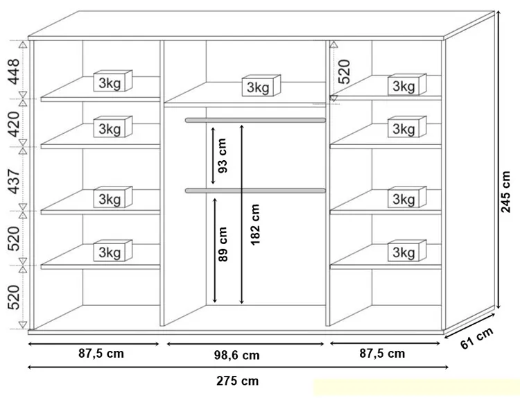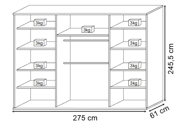 - Wymiary całkowite: wysokość: 245,5 cm, szerokość: 275 cm, głębokość: 61 cm.