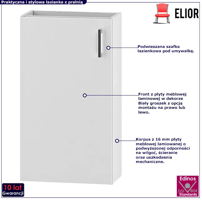 Podwieszana szafka na umywalkę Dals 12X marki Elior to funkcjonalny model przeznaczony do aranżacji łazienki, pralni i pomieszczeń gospodarczych. Korpus oraz front powstał z wysokogatunkowej 16 mm płyty o klasie higieny E1 laminowanej w dekorze Biały groszek. Płyta meblowa dedykowana do pomieszczeń gospodarczych wyróżnia się ponadprzeciętną trwałością i odpornością na wilgoć i parę. Mebel został wyposażony w miejsce do montażu umywalki oraz zamykaną szafkę do przechowywania detergentów lub akcesoriów łazienkowych. Drzwi frontowe dzięki zastosowaniu systemu cichego domyku Blumer 4X Plus otwierają i zamykają się lekko i bezszelestnie. Opcja montażu drzwi na prawo lub lewo pozwala dostosować aranżację do każdej, nawet najmniejszej łazienki, bez konieczności rezygnacji z innych mebli lub urządzeń AGD. Tak wykonana szafka umywalkowa Dals 12X marki Elior praktyczny i ergonomiczny mebel, który fenomenalnie zaaranżuje nowoczesną łazienkę i pralnię.