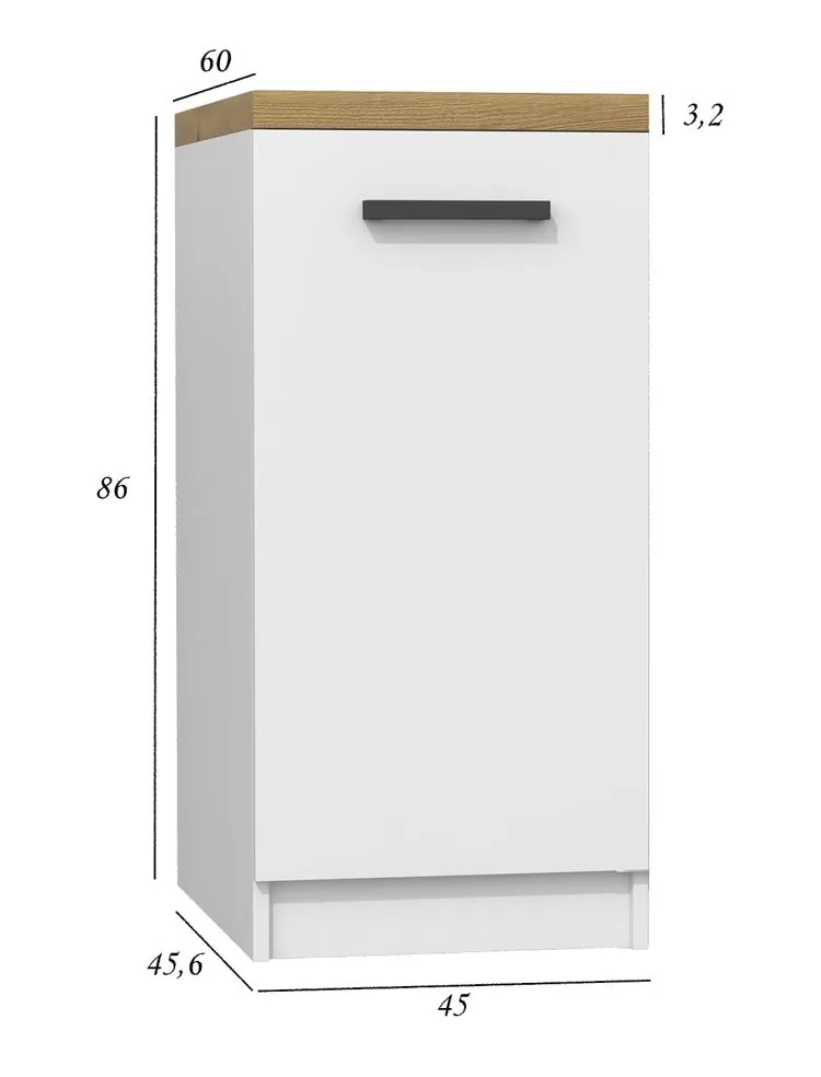 - Wymiary: głębokość wewnętrzna szafki: 45,6 cm, głębokość całkowita szafki wraz z blatem: 60 cm, wysokość całkowita szafki: 86 cm, szerokość całkowita szafki: 45 cm, blat grubości 3,2 cm.
