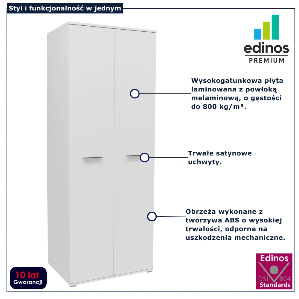 Biała szafa dwudrzwiowa z drążkiem Asendri 13X marki Edinos Premium to praktyczne rozwiązanie dla osób, które potrzebują funkcjonalnej przestrzeni do przechowywania ubrań w kompaktowej formie. Jej smukła, proporcjonalna bryła sprawia, że świetnie sprawdzi się zarówno w mniejszym pokoju, jak i w większej aranżacji jako element uzupełniający zabudowę. Wnętrze szafy zostało zaprojektowane tak, aby zapewnić wygodne przechowywanie odzieży wiszącej oraz dodatkowe miejsce na inne elementy garderoby. To mebel, który łączy estetykę z codzienną wygodą użytkowania.