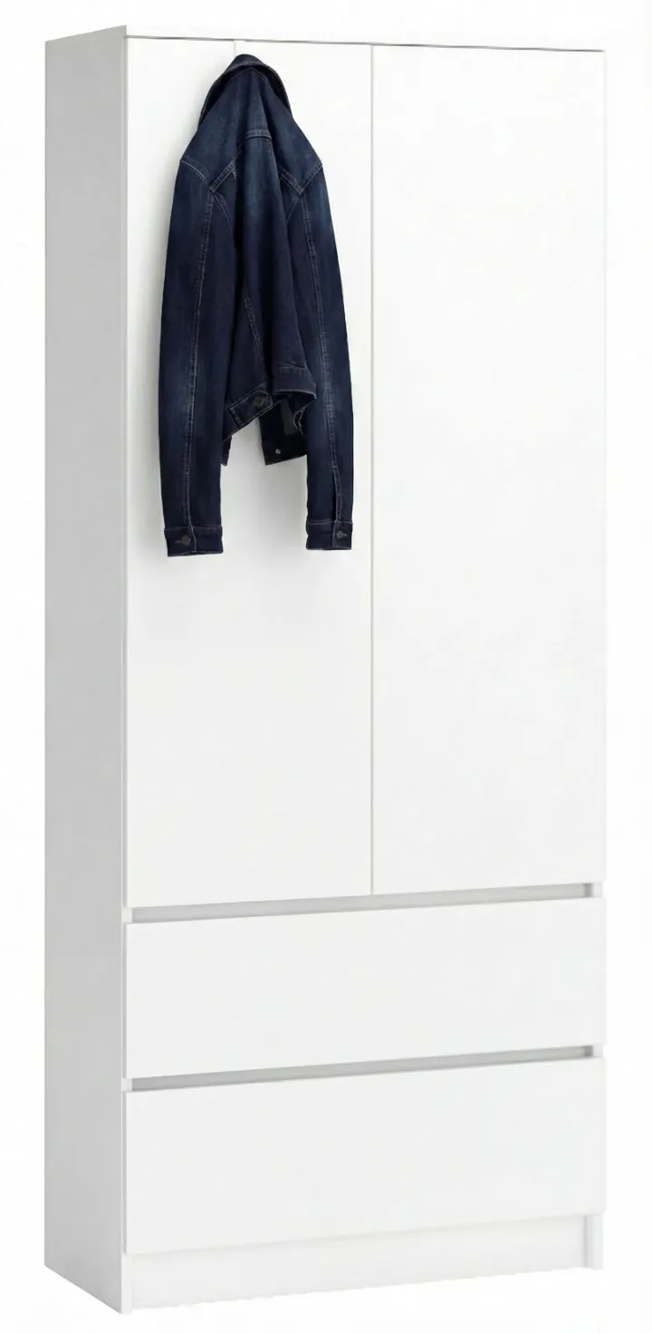 Szafa wykonana została z laminowanej płyty meblowej grubości 16 mm o klasie higieny E1, uszlachetnionej cienkimi filmami melaminowymi. Posiada także specjalne włókna ułożone różnokierunkowo o strukturze sinusoidalnej, co zapewnia nadanie jej cech jakościowych oraz wytrzymałościowych. Dla zwiększenia wytrzymałości i trwałości mebla, obrzeża komody wykończono odpornym na uszkodzenia mechaniczne tworzywem ABS. Szuflady na prowadnicach rolkowych są gwarancją wygodnego i przede wszystkim bezpiecznego użytkowania. Bezuchwytowe fronty podkreślają nowoczesny i modernistyczny styl mebla. Dwie pojemne szuflady są wyjątkowo praktyczne i zapewniają komfortowe przechowywanie nie tylko odzieży czy dodatków. Ukryte za drzwiami 4 półki oraz drążek na ubrania wierzchnie umożliwiają Ci funkcjonalne posegregowanie garderoby i jej estetyczny wygląd. Półki, w zależności od Twych preferencji, możesz zamontować z prawej lub lewej strony. Szafę wyposażono w praktyczny system Tip-On - drzwi mebla otwierane są po delikatnym naciśnięciu frontu. Stonowana kolorystyka i prosta forma sprawiają, że szafa Ollos doskonale odnajduje się we wnętrzach mieszkalnych i usługowych urządzonych w stylu skandynawskim, jak też minimalistycznym czy nowoczesnym. Świetnie sprawdza się także we wnętrzach dziecięcych czy młodzieżowych. Stwórz w swoim domu niepowtarzalny i ciepły klimat z szafą marki Edinos Premium!