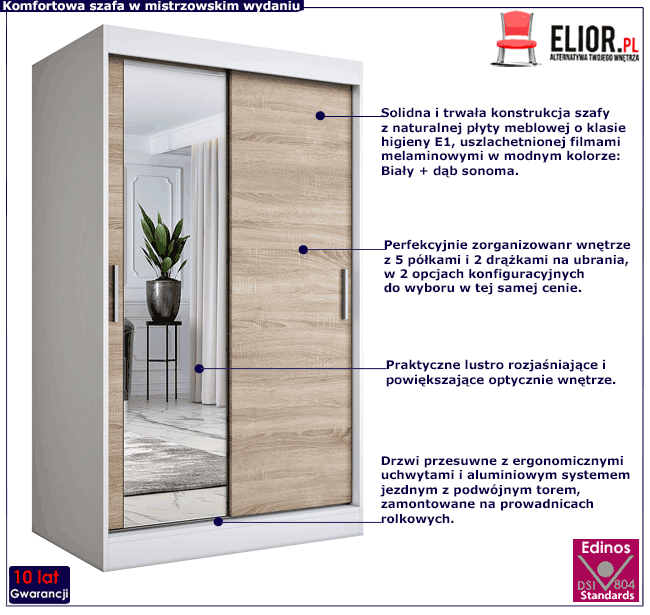 Marka Edinos Premium znana jest z produkcji nowoczesnych, trwałych i bezpiecznych w użytkowaniu mebli. Nasze produkty powstają wyłącznie ze starannie wyselekcjonowanych, ekologicznych i odnawialnych surowców o ustandaryzowanych parametrach jakościowych. Szafa Seko 3X powstała z naturalnej, laminowanej płyty meblowej o grubości 16 mm, o klasie higieny E1. Płyta została uszlachetniona cienkimi filmami melaminowymi, w celu zwiększenia jej trwałości. Zawartość specjalistycznych włókien o strukturze sinusoidalnej, ułożonych różnokierunkowo, dodatkowo nadaje płycie ponadprzeciętnych cech jakościowych. Praktyczne drzwi przesuwne szafy Seko 3X zostały wyposażone w trwały system jezdny wykonany z metalu oraz specjalistycznych tworzyw sztucznych. System jezdny został zamontowany na prowadnicach rolkowych oraz podwójnym torze. Takie rozwiązanie jest sztywniejsze od tradycyjnych pojedynczych torów, dzięki czemu charakteryzuje się ponadprzeciętną trwałością. Drzwi przesuwne mijają się bezkolizyjnie, nie uderzając o uchwyty podczas przesuwania. Dużym atutem tak skonstruowanych drzwi jest znaczna oszczędność przestrzeni. Takie rozwiązanie fantastycznie sprawdza się w pomieszczeniach o ograniczonym metrażu. Lustrzana tafla zamontowana na drzwiach frontowych stanowi praktyczny i wybitnie dekoracyjny dodatek, nadając meblowi klasy i wizualnej lekkości. Dzięki zastosowaniu trwałych materiałów i funkcjonalnym rozwiązaniom aranżacyjnym, szafa Seko 3X to mebel, który nie tylko idealnie przechowa odzieżowe stylizacje, ale także wspaniale wystylizuje Twoje wnętrze!