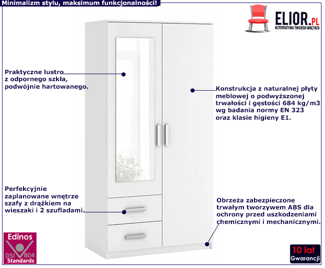 Szafa wykonana została z laminowanej płyty meblowej grubości 16 mm o klasie higieny E1, uszlachetnionej cienkimi filmami melaminowymi. Posiada także specjalne włókna ułożone różnokierunkowo o strukturze sinusoidalnej, co zapewnia nadanie jej cech jakościowych oraz wytrzymałościowych. Dla zwiększenia wytrzymałości i trwałości mebla, obrzeża wykończono odpornym na uszkodzenia mechaniczne tworzywem ABS. Komfortowe lustro wyprodukowano z podwójnie hartowanego szkła, dzięki czemu jest ono całkowicie odporne na rysy i uszkodzenia. Dwie pojemne szuflady są wyjątkowo praktyczne i zapewniają komfortowe przechowywanie nie tylko odzieży czy dodatków. Ukryty za drzwiami stabilny drążek na odzież wierzchnią umożliwia Ci funkcjonalne posegregowanie garderoby i jej estetyczny wygląd. Stonowana kolorystyka i prosta forma sprawiają, że szafa Besari 2S doskonale odnajduje się we wnętrzach mieszkalnych i usługowych urządzonych nie tylko w stylu minimalistycznym, ale też skandynawskim, klasycznym czy nowoczesnym. Świetnie sprawdza się także we wnętrzach dziecięcych czy młodzieżowych. Stwórz w swoim domu niepowtarzalny i ciepły klimat z szafą marki Elior!