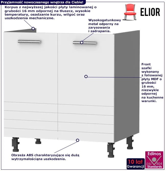 Kolekcję mebli kuchennych Sergio marki Elior wykonano z dbałością o najdrobniejszy szczegół, aby każda z szafek cieszyła Cię niezmiennie latami. Funkcjonalność i najwyższej jakości materiały połączono z nowoczesnym designem. Fronty ozdobiono stylowym frezowaniem, które dodaje kolekcji nietuzinkowego uroku. Wykonano je z najwyższej jakości płyty MDF o grubości 16 mm, specjalnie foliowanej. Materiał ten idealnie sprawdzi się w trudnych warunkach kuchennych i nie straszne mu uderzenia czy tłuste opary i wysoka temperatura. Białe matowe fronty idealnie kontrastują z szarym korpusem. Wykonano go z niezwykle trwałej płyty laminowanej 16 mm grubości marki Elior dedykowanej wnętrzom kuchennym. Szafki posiadają mocne uchwyty stworzone z wysokogatunkowego metalu, a do ich produkcji wykorzystano także niezwykle trwałe obrzeża ABS. W kolekcji Sergio znajdziesz szafkę z najwyższej jakości szkłem podwójnie hartowanym o eleganckim satynowym wykończeniu, która może stanowić idealne miejsce na zastawę stołową. Natomiast górne szafki otwierane do góry zawierają specjalne gazowe podnośniki. Postaw na jakość kolekcji Sergio, która sprawi Ci niezmierną przyjemność.