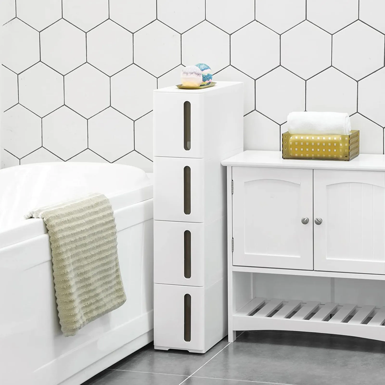 Szafka jest bardzo praktyczna, idealna do małej łazienki. Kółka jeżdżą płynnie, a biały kolor świetnie rozjaśnia przestrzeń. Montaż był prosty, wszystko dobrze spasowane. Solidny i estetyczny mebel w dobrej cenie.