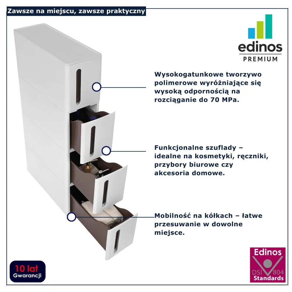 • Funkcjonalne szuflady – idealne na kosmetyki, ręczniki, przybory biurowe czy akcesoria domowe