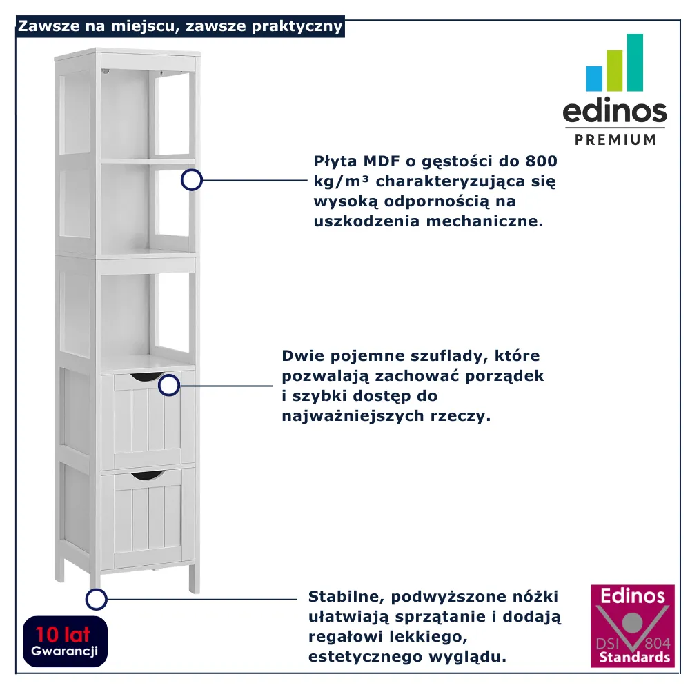 Szukasz mebla, który w pomysłowy sposób uporządkuje Twoją przestrzeń, a przy tym świetnie odnajdzie się w każdym wnętrzu? Wąski regał Windox 3X marki Edinos Premium to praktyczna propozycja dla osób ceniących ład, minimalizm i funkcjonalność. Jego smukła forma sprawia, że bez trudu zmieści się w łazience, kuchni, pralni, sypialni czy przedpokoju. Głębokie szuflady pomogą Ci wygodnie posegregować wszystkie niezbędne drobiazgi – od ręczników i kosmetyków po akcesoria, które chcesz przechowywać poza zasięgiem wzroku. Neutralna kolorystyka subtelnie podkreśli aranżację pomieszczenia i doda mu wizualnej lekkości. To mebel, który łączy w sobie estetykę, wygodę i praktyczność na co dzień.
