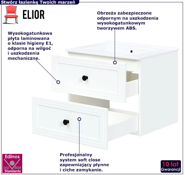 • Produkt posiada certyfikat jakości "Edinos Standards DSI 804", który potwierdza najwyższą jakość wykonania mebla oraz pełny stopień zgodności poszczególnych jednostek wytworzonego wyrobu z przyjętym wzorcem.