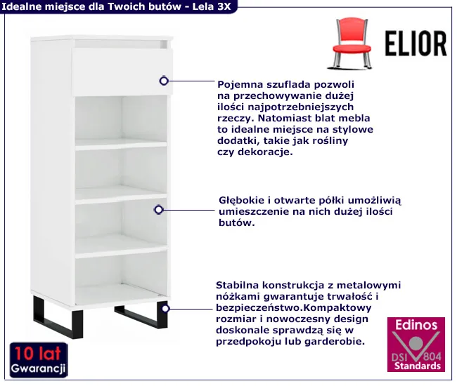 Szafka na buty Martisa 3X marki Edinos Premium to synonim nowoczesności i praktyczności, który wzbogaci każde wnętrze. Solidna konstrukcja i stylowy design to gwarancja długotrwałego użytkowania. Zdecyduj się już dzisiaj na zakup w rewelacyjnej cenie 268 zł.