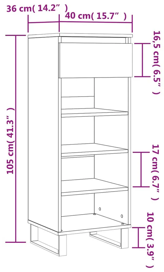 • Wymiary szafki na buty: wysokość 105 cm; szerokość 40 cm; głębokość 36 cm