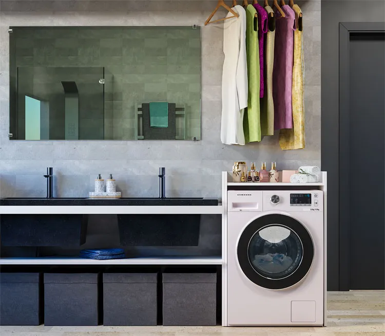 Trzeba wypiąć wszystkie węże oraz przewód zasilający, wyciągnąć pralkę, wstawić szafkę i wpychając pralkę kolejno podłączyć przewody.