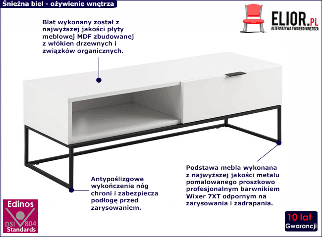 Blat w kolorze bieli wykonany został z naturalnej płyty meblowej MDF zbudowanej z włókien drzewnych i związków organicznych w warunkach wysokiego ciśnienia i temperatury. Włókna ułożone są różnokierunkowo, o strukturze sinusoidalnej, co zapewnia nadanie jej cech jakościowych oraz wytrzymałościowych. Dodatkowo płyta została uszlachetniona cienkimi filmami melaminowymi w celu zwiększenia jej trwałości. Brzegi mebla oklejono specjalistycznym materiałem ABS, cechującym się ponadprzeciętną odpornością na zarysowania. Konstrukcja mebla wykonana została z najwyższej jakości metalu nierdzewnego pomalowanego proszkowo odpornym na zarysowania i zadrapania. Najwyższa jakość techniki metody natrysku proszkowego pozwoliła zaoferować firmie Elior aż 10 lat gwar. na swoje produkty. Technika malowania proszkowego charakteryzuje się dużą trwałością, odpornością na korozję, chemikalia, wysoką temperaturę oraz uszkodzenia mechaniczne, dzięki czemu znacznie podnosi walory użytkowe i estetyczne mebla. Dodatkowo wykończenie nóżek mebla zostało uszlachetnione o antypoślizgowe zabezpieczenie chroniące podłogę przez zarysowaniem i uszkodzeniami mechanicznymi.