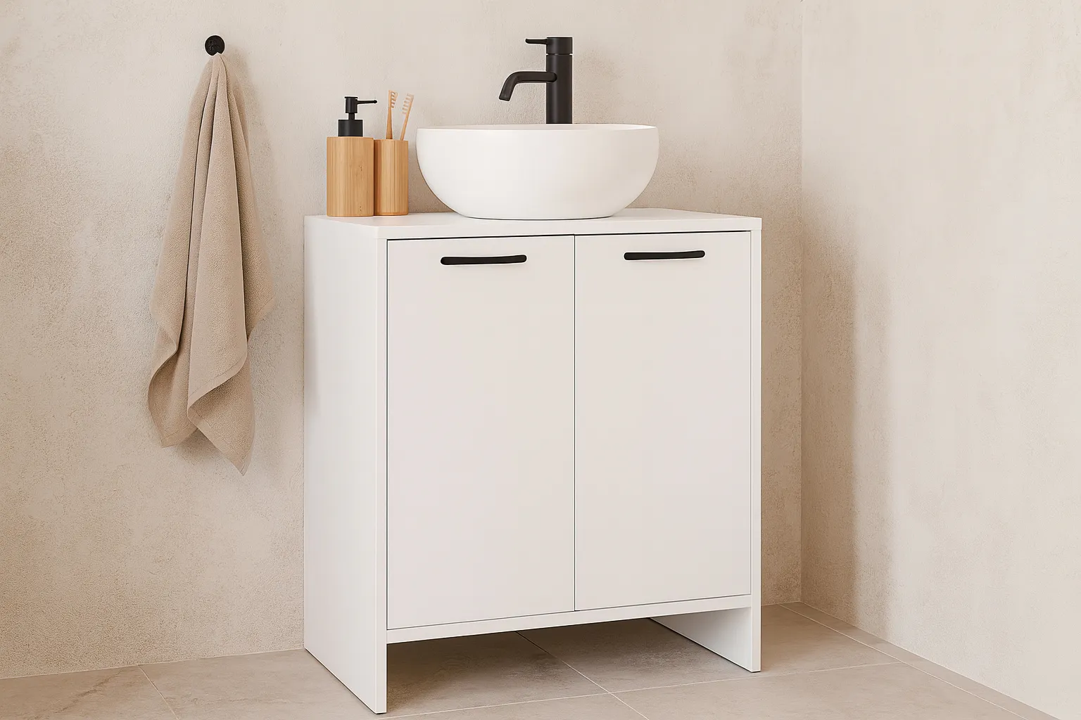 • Dwoje praktycznych drzwi – zapewniają wygodny dostęp do wnętrza, w którym zmieścisz środki czystości, kosmetyki i akcesoria łazienkowe.
