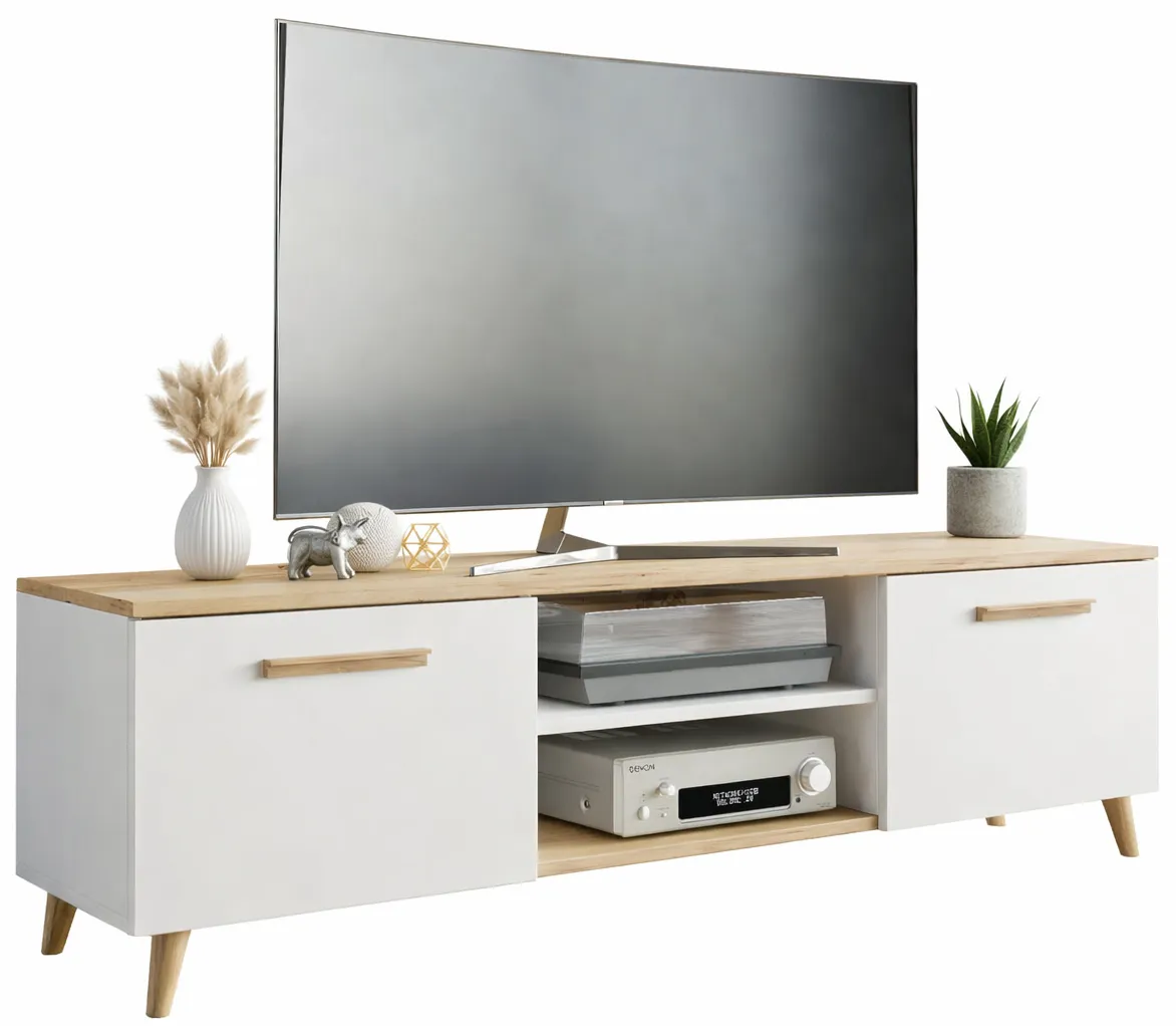 Jesteś zwolennikiem lekkiego, skandynawskiego looku? Lubisz gdy we wnętrzu panuje wszechobecna harmonia i ład? Doskonale się składa. Szafka RTV Nivegi 3S to projekt stworzony dla osób gustujących w takim właśnie stylu. Charakteryzuje się ona prostotą, lekkością wizualną, jasnymi barwami oraz w dużej mierze odnosi się do natury. Biały korpus mebla wspaniale podkreślony został blatem, uchwytami oraz delikatnymi nóżkami w odcieniu dębu artisan. Mebel ten dzięki temu ociepla atmosferę wnętrza oraz dzięki jasnej koorystyce wizualnie powiększa jego przestrzeń. Delikatny charakter Nivegi 3S sprawia, że jest świetną bazą do stworzenia oryginalnej aranżacji. Wspaniale łączy się z inną kolorystyką, dzięki czemu Twoje ulubione, musztardowe zasłony dopasują się bez najmniejszego problemu do mebla. Nivegi 3S posiada dwie szafki z frontami po lewej i prawej stronie oraz dwie odkryte półki na śrofku mebla. Dzięki tej doskonałej szafce idealnie zorganizujesz przestrzeń mieszcząc w jej wnętrzu wszystkie potrzebne przedmioty i zachowując tym samym wyjątkowy ład w aranżacji salonu. Zadbaj o elegancki design w miejscu, które służy Ci do wypoczynku. Postaw na wspaniałą szafkę RTV Nivegi 3S i spędzaj czas z radością!