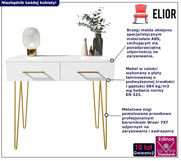 Optymalna temperatura do przechowywania szminki wynosi 20-25°C. Nie trzymaj pomadki w lodówce, bo skracasz jej żywotność (wtedy jej stabilność to ok. 2-3 miesiące), kiedy standardowa żywotność to ok. 3 lata. Najlepiej, kiedy kosmetyki zawsze są pod ręką niezależnie, czy mówimy tutaj o szmince, kremie pod oczy, podkładzie, czy tuszu do rzęs. Z toaletką młodzieżową Perissa marki Edinos Premium ciągłe poszukiwania pomadki, czy błyszczyka w torebce bez dna pójdą w zapomnienie! Cudowna biel kontrastująca ze złotem uchwytów oraz fantazyjnych nóg to design, który pokochasz od pierwszego wrażenia. Dzięki niebanalnej formie toaletka Perissa idealnie wkomponuje się do sypialni urządzonej zarówno w stylu skandynawskim, nowoczesnym, czy klasycznym. To idealny niewielki mebel do pokoju nastolatki. Zaszalej i zdecyduj się na toaletkę młodzieżową Perissa marki Edinos Premium, a nauka pielęgnacji dla Twojej dorastającej córki będzie tylko przyjemnością!