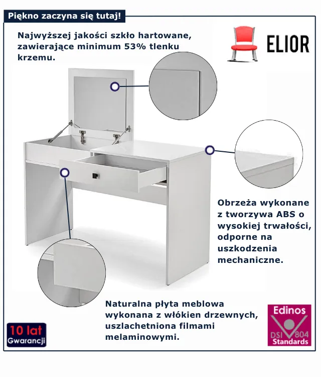 Toaletka Lilou marki Edinos Premium to inwestycja w styl i wygodę na co dzień. Dzięki ponadczasowemu designowi i praktycznym rozwiązaniom, ten mebel stanie się ulubionym elementem Twojej przestrzeni. A teraz pytanie: czy nie warto otoczyć się przedmiotami, które łączą piękno z funkcjonalnością? Sprawdź ofertę już dziś i wybierz swoją wymarzoną toaletkę w cenie za jedyne 958 zł. Nie czekaj – Twój kącik marzeń czeka!