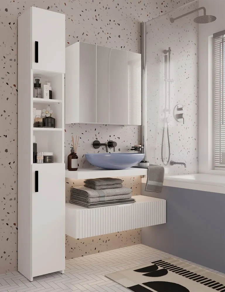 • 6 praktyczne półki: umożliwiają uporządkowane i łatwo dostępne przechowywanie Twoich ręczników, kosmetyków i środków czystości.