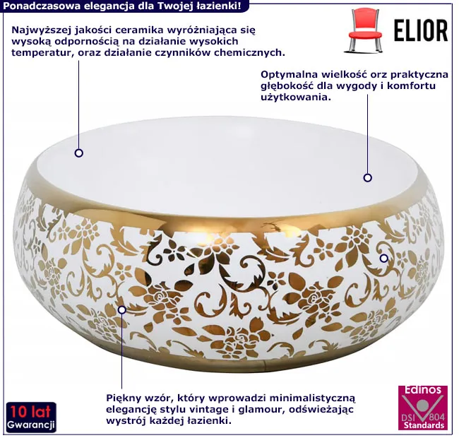• Kolor: biały + złoty. Kliknij w link i sprawdź także inne umywalki nablatowe w sklepie Edinos.pl. Stwórz swóją praktyczną przestrzeń.