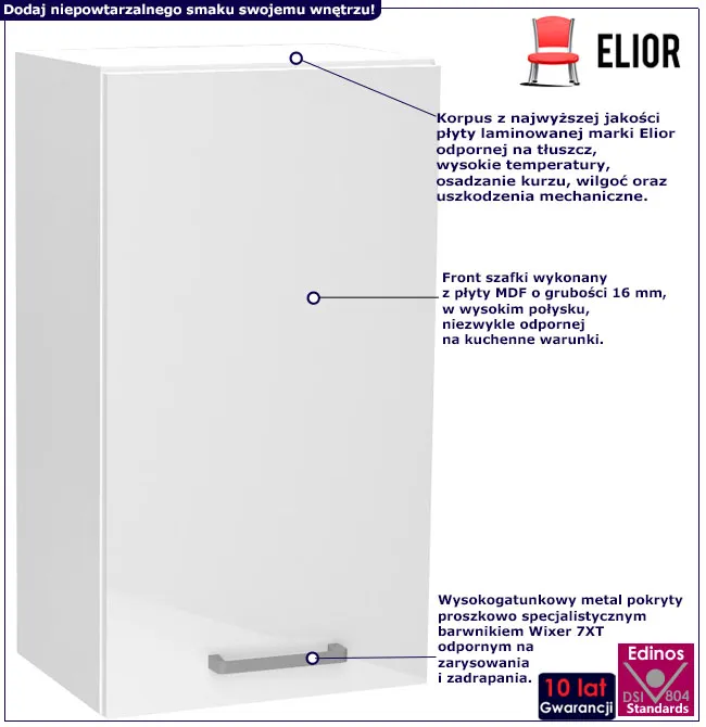 Kolekcje mebli kuchennych Elora marki Elior stworzyliśmy z dbałością o każdy szczegół, tak by wybrane przez Ciebie meble służyły Ci niezmiennie przez długie lata. Dzięki nim dodasz smaku Twojemu wnętrzu i urządzisz kuchnię swoich marzeń. Wybieraj spośród aż 27 modułów lub 2 uniwersalnych kompletów o długości 180/240 cm oraz 260 cm. Kuchnia ma służyć Ci długo, dlatego oczekujesz od niej funkcjonalności oraz trwałości. Z tego powodu każdy z białych korpusów szafek kolekcji Elora wyprodukowany został z najwyższej jakości płyty laminowanej o klasie higieny E1, niezwykle odpornej na warunki panujące w kuchni podczas gotowania. Fronty wykonano natomiast z płyty MDF o wysokim połysku, przepięknie komponującej się razem z mocnymi uchwytami stworzonymi z wysokogatunkowego metalu o wykończeniu podobnym do chromowanej stali. Do wyprodukowania kolekcji Elora wykorzystano także najwyższej jakości szkło podwójnie hartowane, niezwykle odporne na uderzenia i zarysowania w eleganckiej wersji satynowej. Każdą szufladę wzmocniono za pomocą wkładu o głębokości 40 cm typu METALBOX, co daje fantastyczny komfort w codziennym użytkowaniu. Do zestawu dołączony jest biały cokół do każdej z dolnych szafek oraz regulowane nóżki. Fronty otwierają się dzięki trwałym metalowym zawiasom, a górne szafki uchylne do góry za pomocną specjalnych, wysokiej jakości gazowych podnośników. Wybierz jakość mebli marki Elior, która zostanie z Tobą na długo i ciesz się swoją kuchnią niezmiennie, latami.